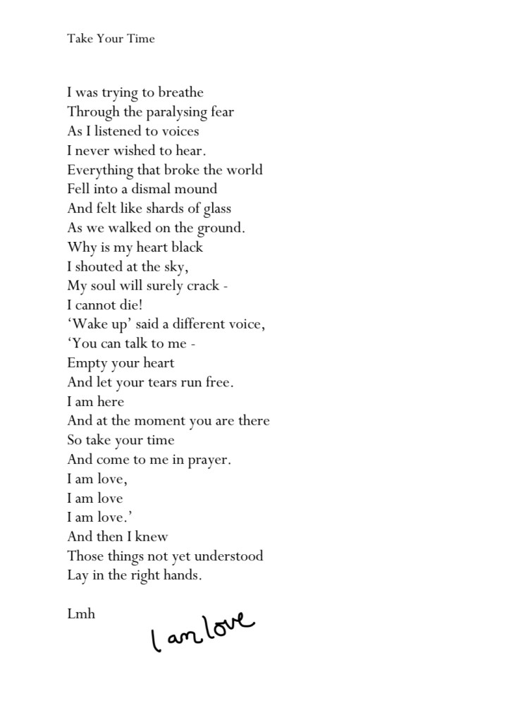 This field exists I am sure, but for now, go there in your mind. It is beautifully green and fertile. The sky above is blue and the sun is shining. You can feel the warmth on your back. Many other people are there too. They are peaceful and smiling serenely. You all join hands and pray for peace. You feel your soul lift. You know you are acting for the common good and working to create trust and cooperation. You feel better for having been to the field and you are feeling hopeful. You can revisit the field whenever you need reassurance.